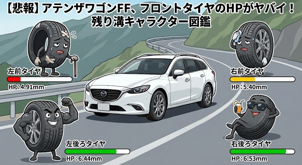 特に**「左前」**が一番減っていますが、これは日本の道路事情(路面が左に傾斜している)や、左折時の小回りによる負担増によるもので、ある意味正常な減り方です。